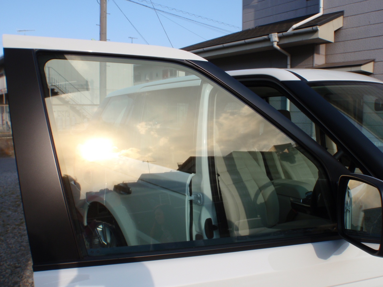 ディーラーでは完全に透明フィルムなんですが、これはチタン含有なので薄く金色です。撮った時間が朝夕だと、こんな感じで反射します。